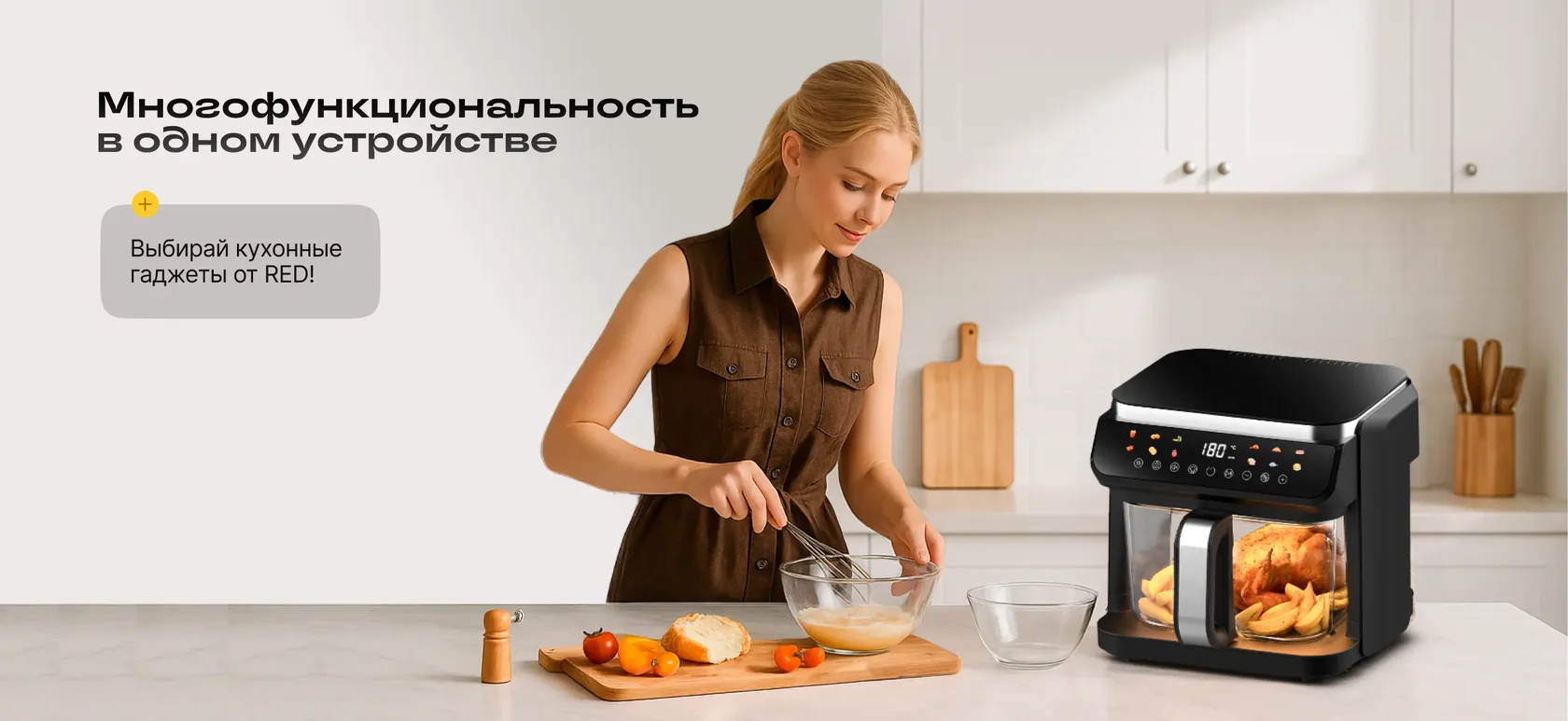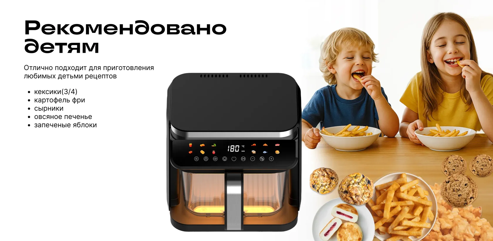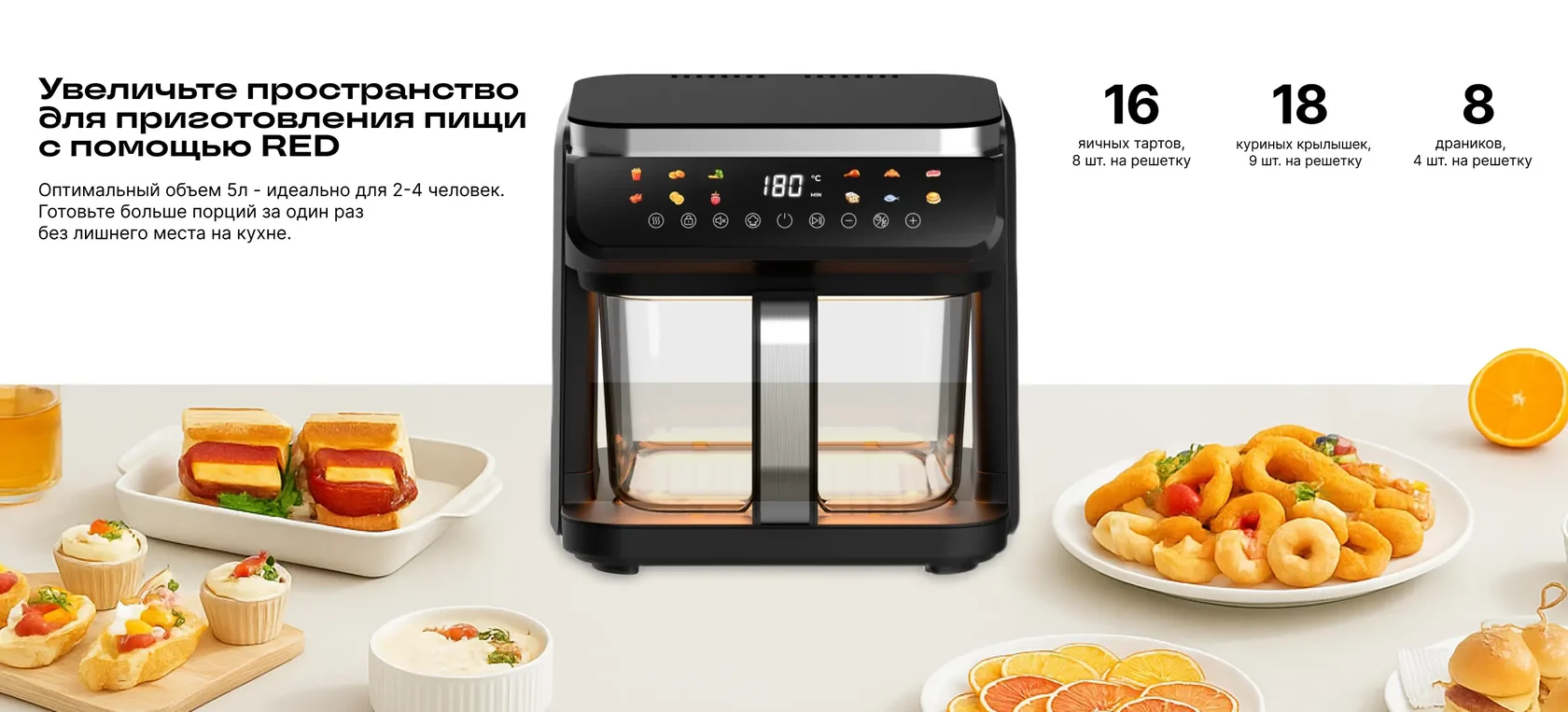Аэрогриль имеет стильный и современный дизайн, который легко вписывается в любую кухню. Корпус выполнен из качественного пластика, а стеклянная чаша позволяет наблюдать за процессом приготовления. Удобная ручка не нагревается и обеспечивает комфортное использование. Аэрогрильпредлагает множество функций, которые делают его универсальным помощником на кухне. Управление аэрогрилем интуитивно понятное. На панели управления расположены кнопки для выбора температуры и времени, а также предустановленные программы для различных блюд. Это позволяет легко готовить даже тем, кто не имеет большого опыта на кухне. Качество приготовления пищи в Red ColorCook G550 на высоком уровне. Продукты получаются равномерно пропеченными и хрустящими снаружи, сохраняя при этом сочность внутри. Особенно радует возможность готовить без масла или с минимальным его количеством, что делает блюда более полезными. Чаша аэрогриля достаточно вместительная, что позволяет готовить порции для всей семьи. Легкость в очистке также является большим плюсом: съемные элементы можно мыть в посудомоечной машине, а поверхность легко протирается. В целом, аэрогриль Red ColorCook G550 – это отличный выбор для тех, кто хочет готовить быстро и вкусно, уделяя внимание здоровому питанию. Он сочетает в себе функциональность, простоту использования и стильный дизайн. Рекомендуется всем, кто ценит удобство и качество в приготовлении пищи.