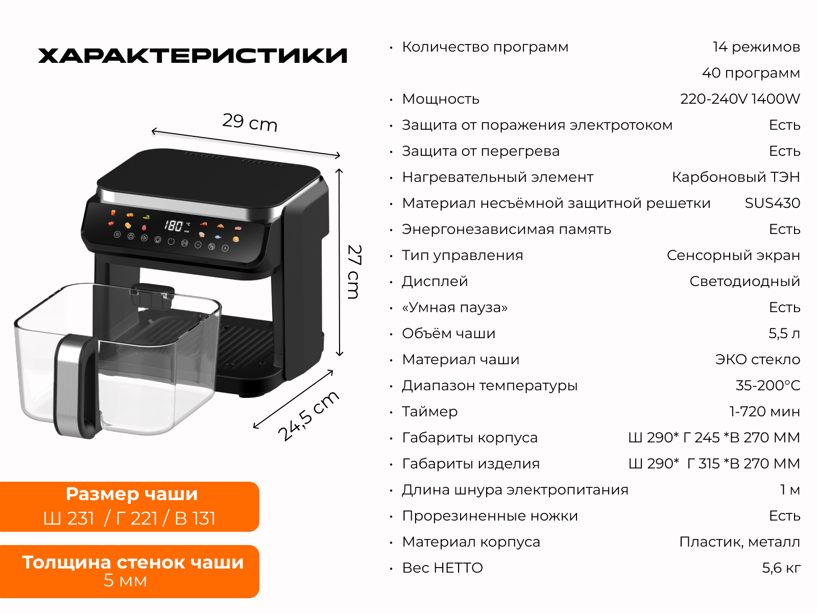 Чаша объемом 5,5 л из ЭКО стекла с усиленными стенками 5 мм позволяет готовить блюда для всей семьи, сохраняя сочность и текстуру продуктов.
