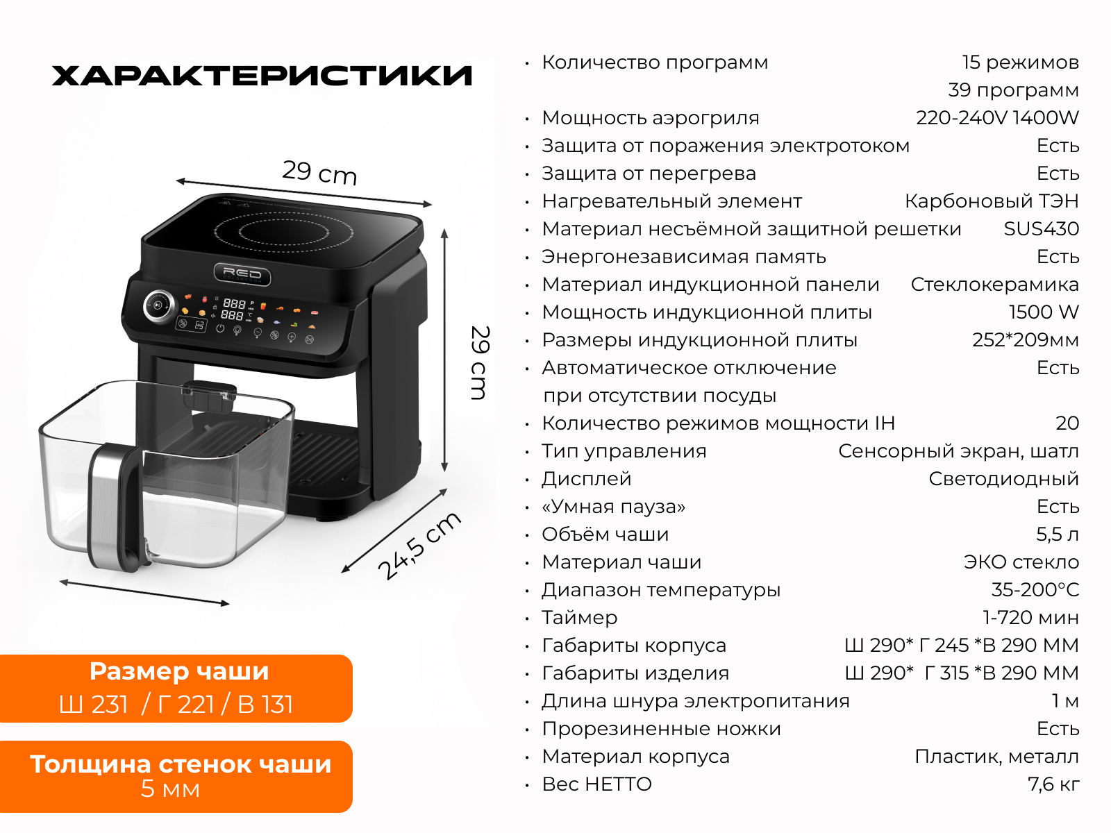 — вместительная чаша 5,5 л из ЭКО стекла